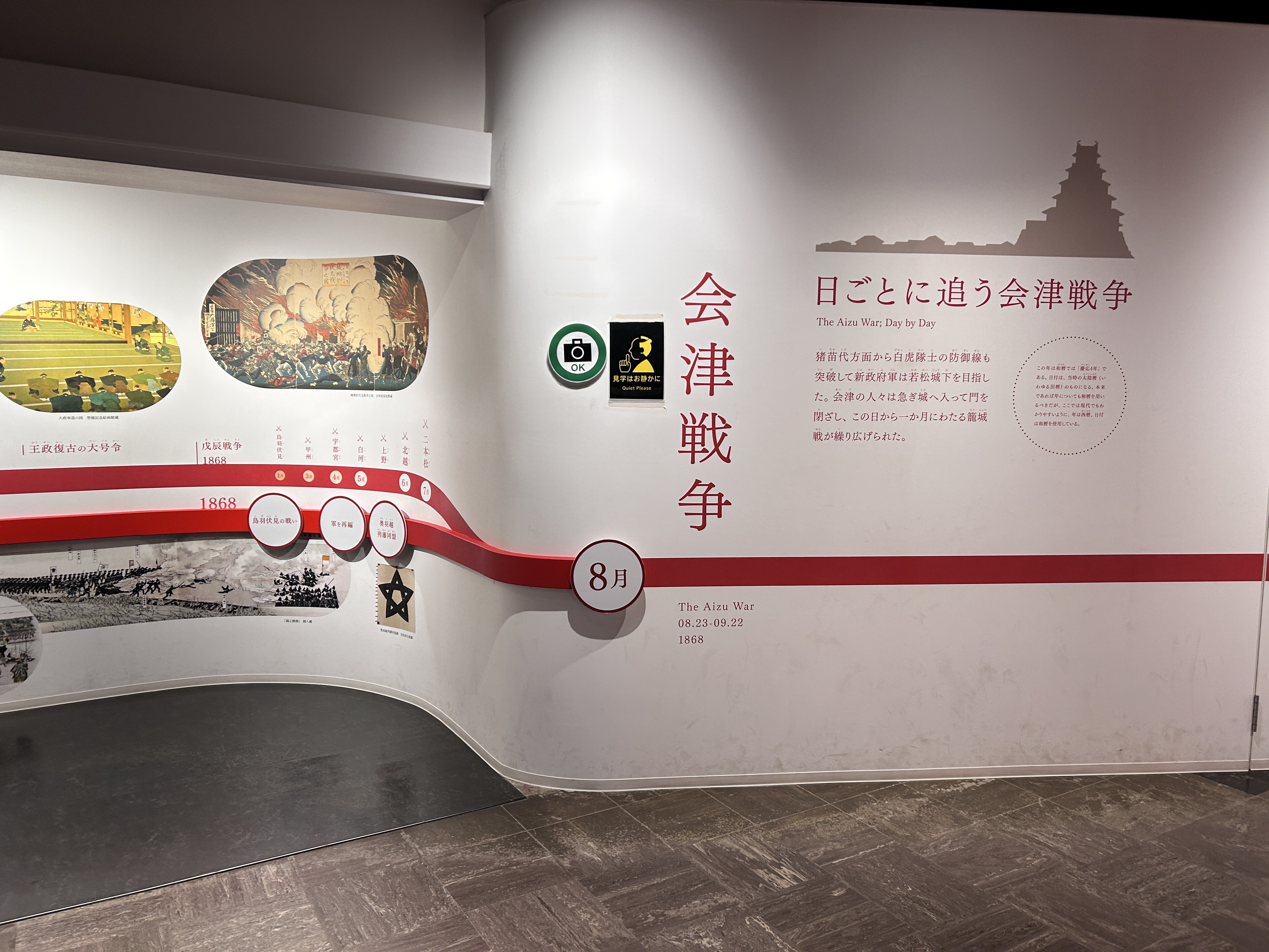 階段を上がった第三層では、日ごとにピックアップした時系列で構成された会津戦争の年表展示。