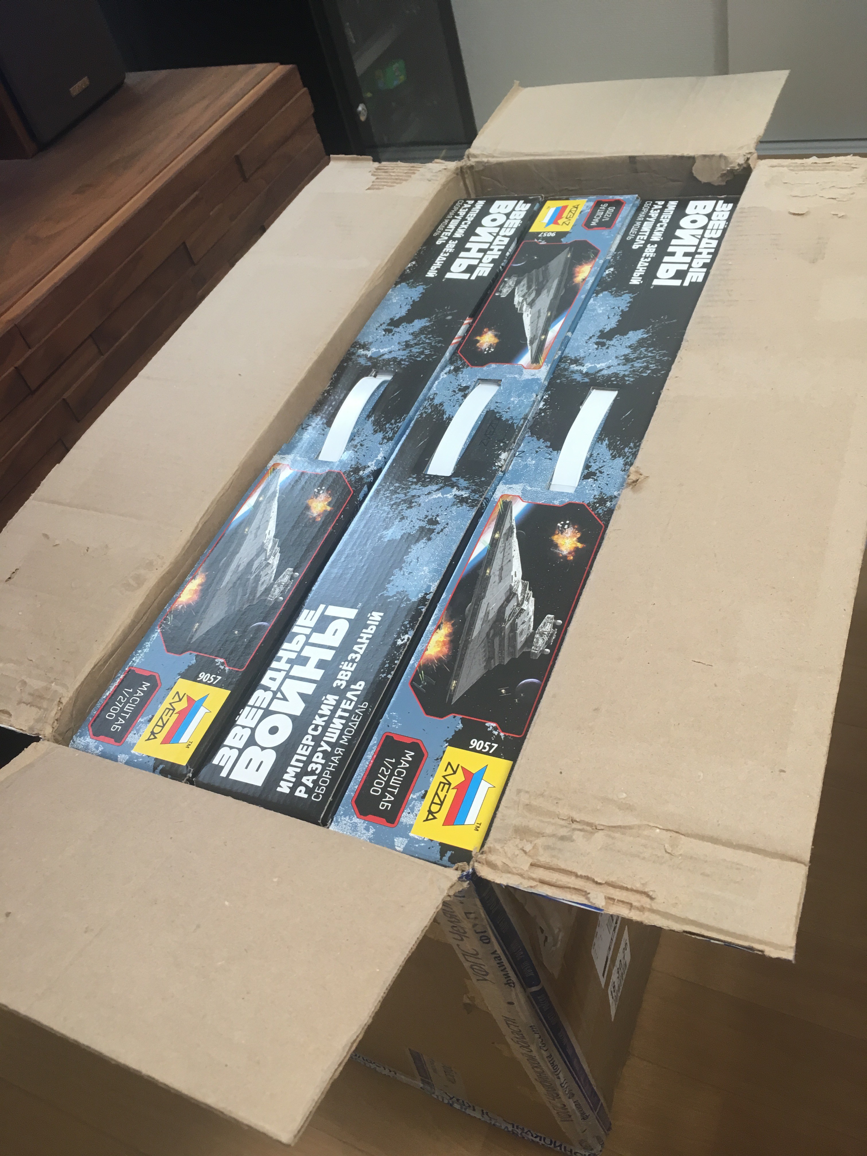 あの映画に出てくる、あの巨大戦艦です。 いいですねぇ!カッコいいです! でも、これ版権の絡みで日本では発売がされないのです。 そこで、友人と3人でロシアの模型店から共同で購入をしてしまおうと言う話が持ち上がりました。 とは言ったものの海外サイトからの買い物なんて皆初めて、 そもそもお金を送金してもちゃんと発送されるのか?など不安や解らないことだらけ・・・ でも欲しい物は欲しい、そしてプラモデルの世界は一度生産完了すると 再生産がなかなかされない一期一会の世界。 ということで思い切って購入へ踏み切りました。 しかしながら、その後約束のブツは一向に届かず・・・ 発注したのは、1月3日のお正月、結果日本に届いたのは3月1日でした。 2ヶ月掛かりましたが、予想通り色々と紆余曲折があったわけで。 ・ロシアの模型屋さんはのんびり対応、発送したのは発注から10日後 ・船便で発送したらしいがいつまでたっても届かず ・これはおかしい、と言うことになり友人Fが慣れない英語でメールやりとり ・結果、船便はどこかで行方不明(笑)になったらしく、航空便(保険付き)で再発送 ・貨物便の関係かロシアのはるか西の地方空港を経てようやく日本に到着 と言う流れです。順調だと2週間くらいで到着するらしいのですが。 模型屋さんのメール対応がしっかりしていたのがせめてもの救いでした。 届いた荷物がこちら。
